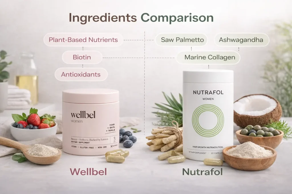Wellbel and Nutrafol use very different ingredients. Wellbel focuses on biotin, antioxidants, and plant-based nutrients that support hair appearance. These ingredients help hair feel smoother and stronger but do not directly stop shedding. Nutrafol includes adaptogens like ashwagandha and saw palmetto, which help balance stress and hormones. It also uses marine collagen and minerals that support scalp health. Nutrafol’s ingredients are chosen to solve hair loss from the inside. This difference explains why Nutrafol often works better for women with ongoing or hormonal hair thinning.